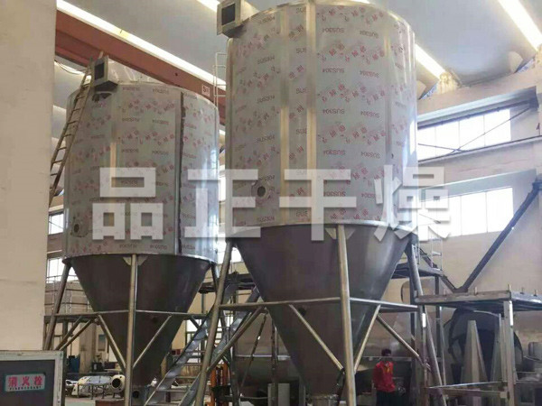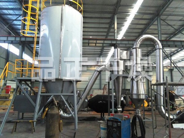 本機組工作過程為料液通過隔膜泵高壓輸入,噴出霧狀液滴,然后同熱空氣并流下降,大部分粉粒由塔底排料口收集,廢氣及其微小粉末經旋風分離器分離,廢氣由抽風機排出,粉末由設在旋風分離器下端的授粉筒收集,風機出口還可裝備二級除塵裝置,回收率在96-98%以上。