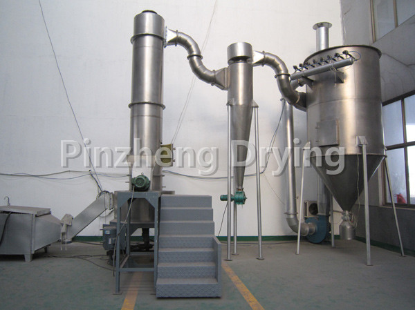 The hot air tangent enters the bottom of the dryer and forms a strong rotating wind field driven by the agitator. The paste material enters the dryer through the screw feeder. Under the strong action of the high-speed rotating agitator, the material is dispersed under the impact, friction and shear force. The block material is quickly crushed, fully contacted with the hot air, heated and dried. The dehydrated dry material rises with the hot air flow, the grading ring intercepts the large particles, and the small particles are discharged from the center of the ring outside the dryer, and recycled by the cyclone separator and dust collector. The dry or large materials are thrown to the wall by centrifugal force, and then fall back to the bottom for crushing and drying.