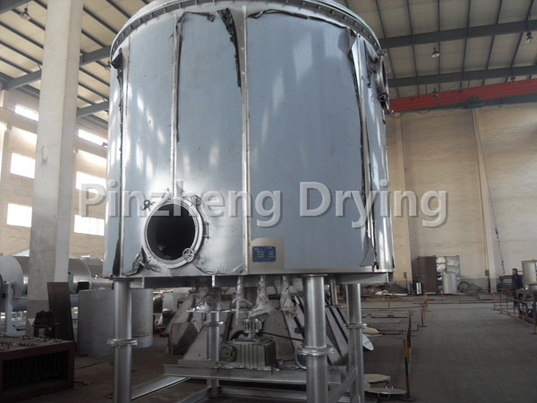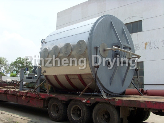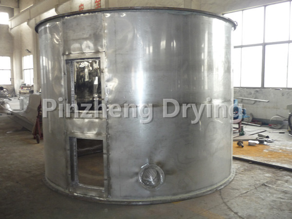 The wet material is continuously added to the first layer of drying plate on the upper part of the dryer from the feeder. The rake arm with the rake blade rotates to make the rake arm rotate to make the rake blade continuously turn over the material. The material flows through the surface of the drying plate along the exponential spiral. The material on the small drying plate is transferred to the outer edge, and falls to the outer edge of the large drying plate below. The material on the large drying plate moves inward and falls into the following layer of small drying plate from the middle dropping hole. The large and small drying plates are arranged alternately up and down, so that the materials can continuously flow through the whole dryer. The hollow drying plate is filled with heating medium in the form of saturated steam, hot water and heat transfer oil. The heating medium enters from one end of the drying plate and exits from the other end. The dried material falls from the last layer of drying plate to the bottom layer of the shell, and is finally transported to the discharge port by the rake blade. Moisture escapes from the material and is discharged from the moisture discharge port on the top cover. The moisture of the vacuum disc dryer is discharged from the vacuum pump port on the top cover. The dry materials discharged from the bottom layer can be directly packed. By adding auxiliary machines such as fin heater, solvent recovery condenser, bag filter, dry material back-mixing mechanism, induced draft fan, etc., the drying capacity can be improved. The paste and heat-sensitive materials can be dried, and the solvent can be easily recovered, and the pyrolysis and reaction operation can be carried out.